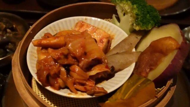 セイロの中には “豆腐の甘辛煮・豚キムチ・蒸し野菜” が入っています。