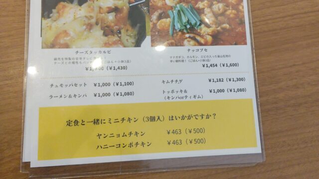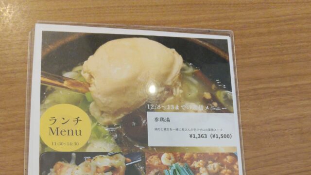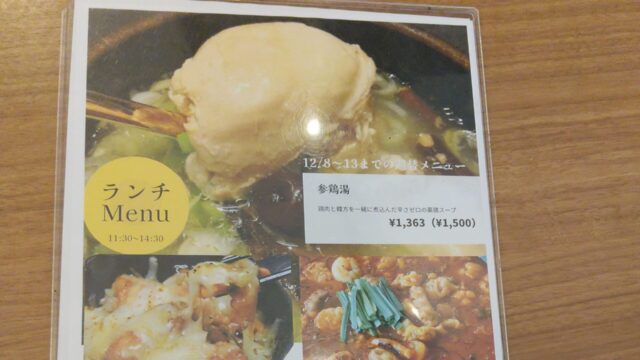 因みにこの時(R7年12月)のランチメニューはサムゲタン、チーズタッカルビ、ナッコプセ、チュモッパセット、キムチチゲ、ラーメン&キンパ、トッポッキ&(キンパorティギム)