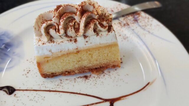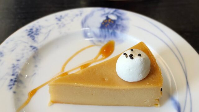 食後はお楽しみのケーキタイム。今回はおイモのケーキを選びました。濃厚でねっとりとした舌触りは、まるで上品な芋ようかんのよう。甘さ控えめで、食後のデザートにぴったりでした。ドリンクと一緒に、少しのんびりできる時間も嬉しいポイント。