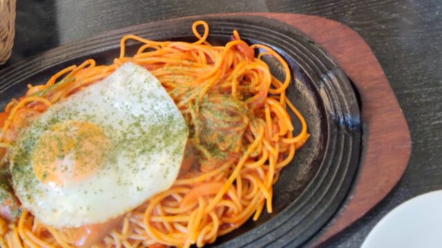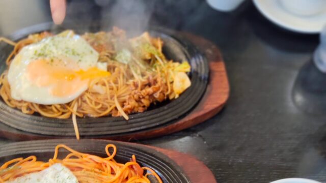 私は「ナポリタン」友達は、ちょっと珍しい「焼きそばスパゲティ」を注文しました。どちらも鉄板で提供されるので、テーブルに届いた瞬間からジュージューと食欲をそそる音と香り!