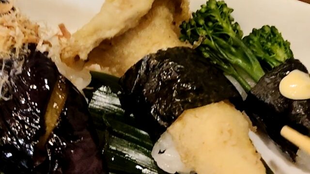 なすのお寿司は、くたくたに火が通っていて、口の中でとろける感じ。なすのお寿司が二貫入っていたのは嬉しかった💕エリンギも油であげててこってりしていておいしかったです。今まで「野菜のお寿司なんて…」と思っていた自分の価値観が、ここで一気にひっくり返りました。